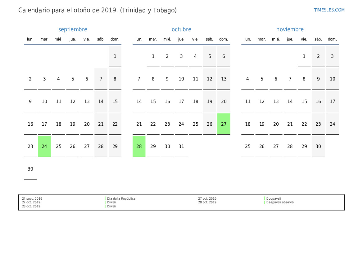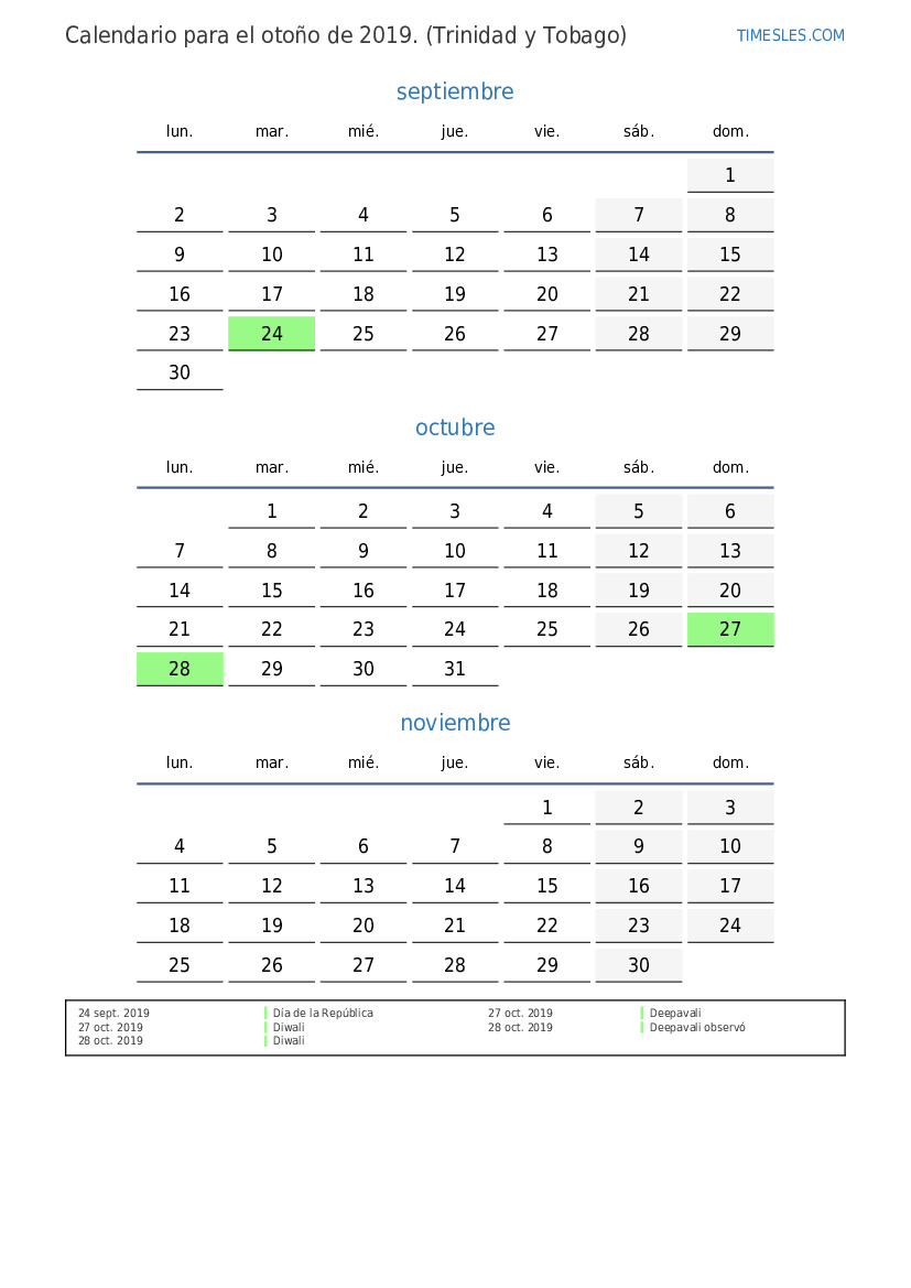 Descargue e imprima el calendario en PDF con festivos y fines de semana para el otoño de 2019 para Trinidad y Tobago