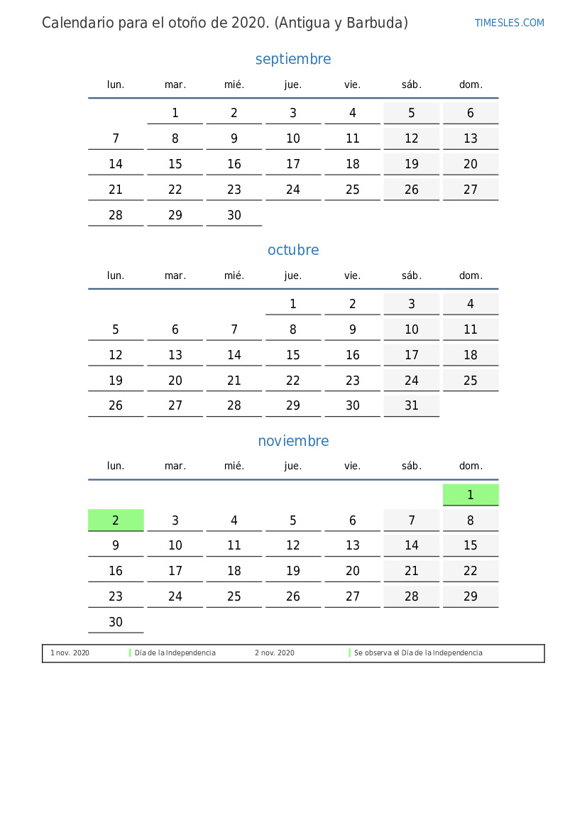 Descargue e imprima el calendario en PDF con festivos y fines de semana para el otoño de 2020 para Antigua y Barbuda