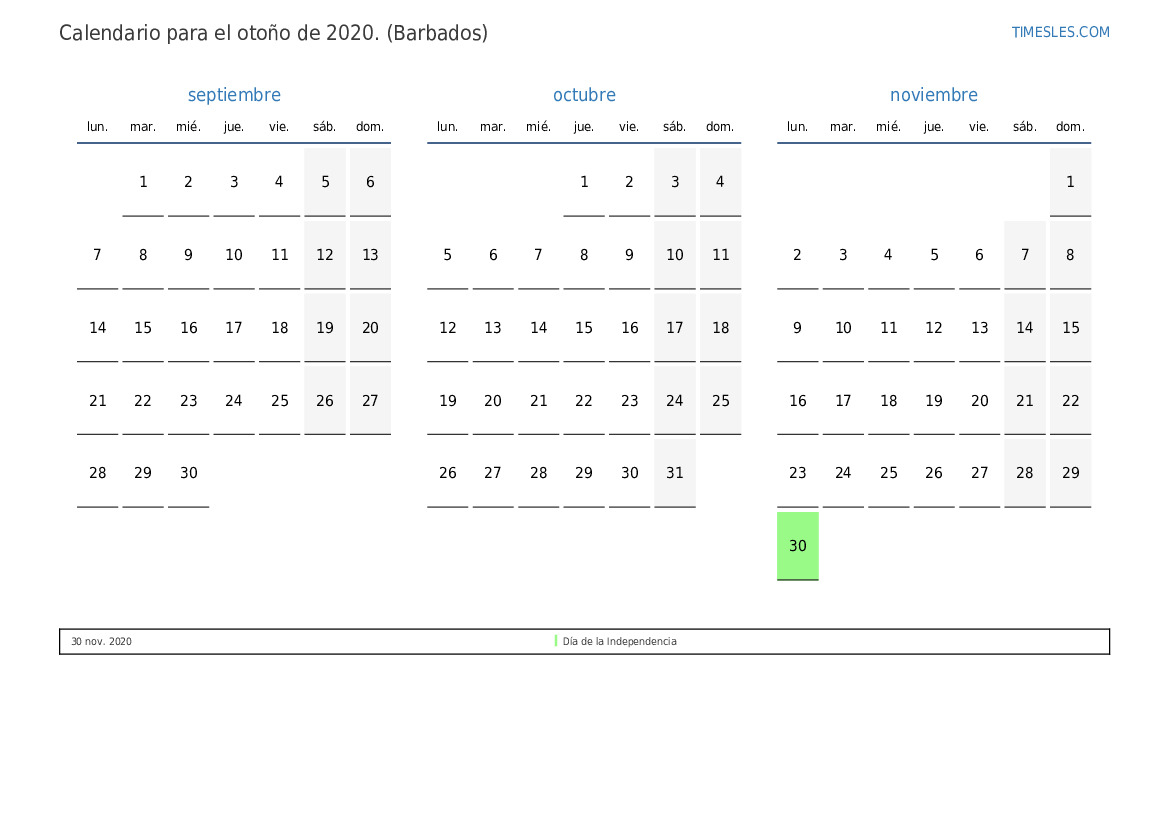Descargue e imprima el calendario en PDF con festivos y fines de semana para el otoño de 2020 para Barbados