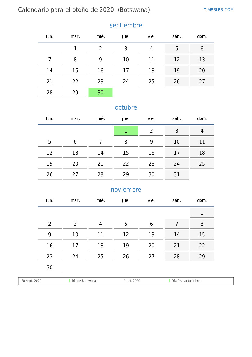 Descargue e imprima el calendario en PDF con festivos y fines de semana para el otoño de 2020 para Botswana