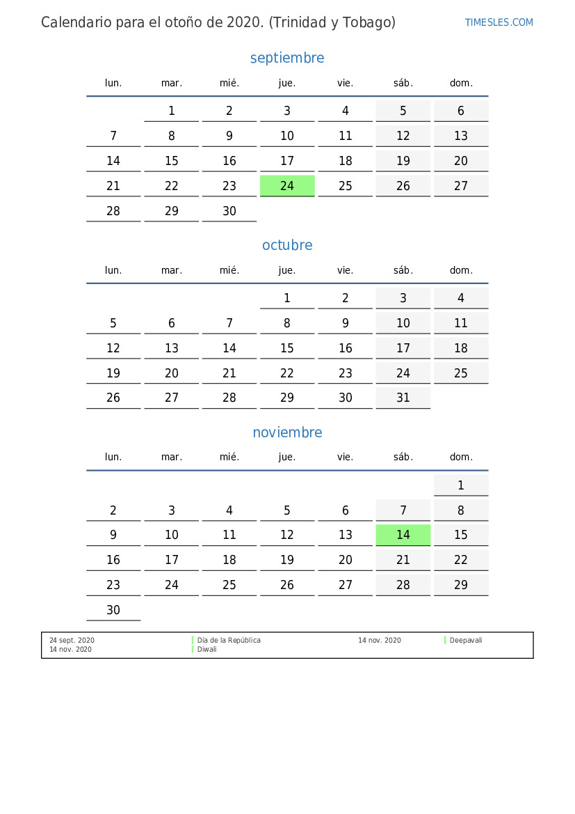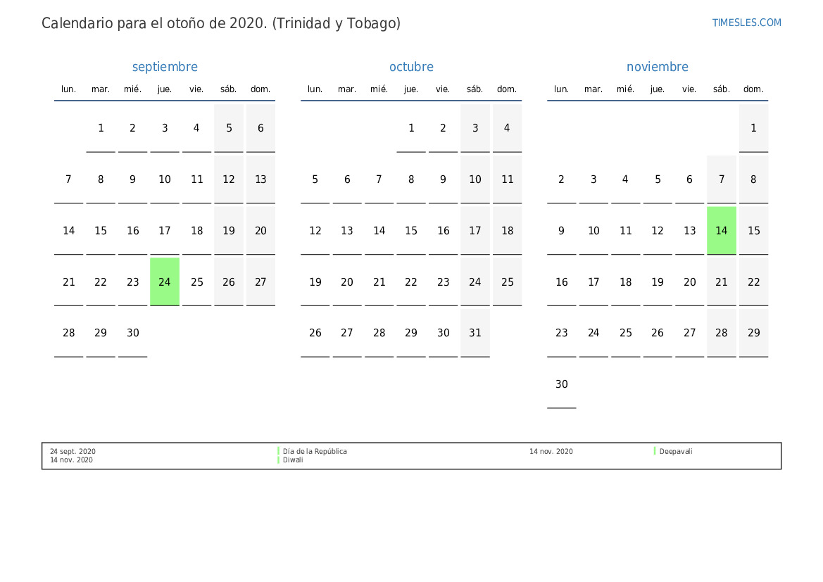 Descargue e imprima el calendario en PDF con festivos y fines de semana para el otoño de 2020 para Trinidad y Tobago