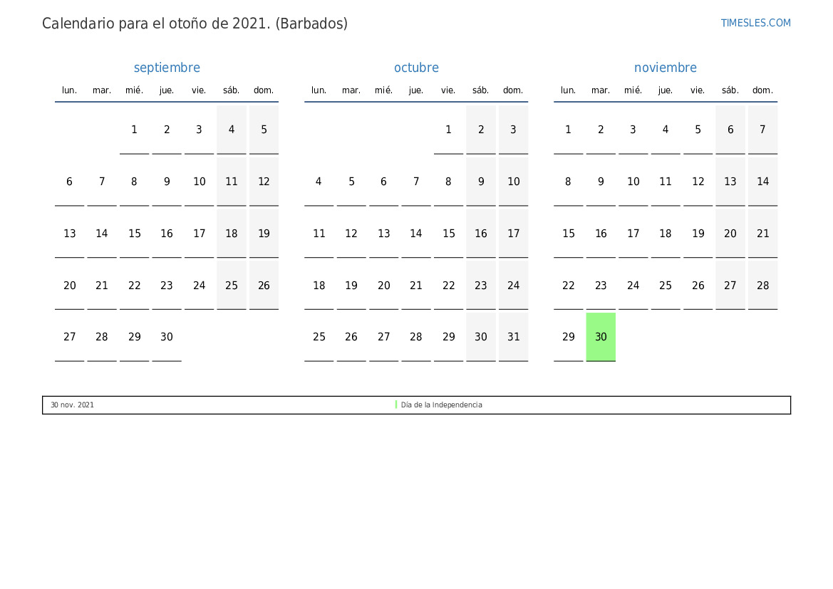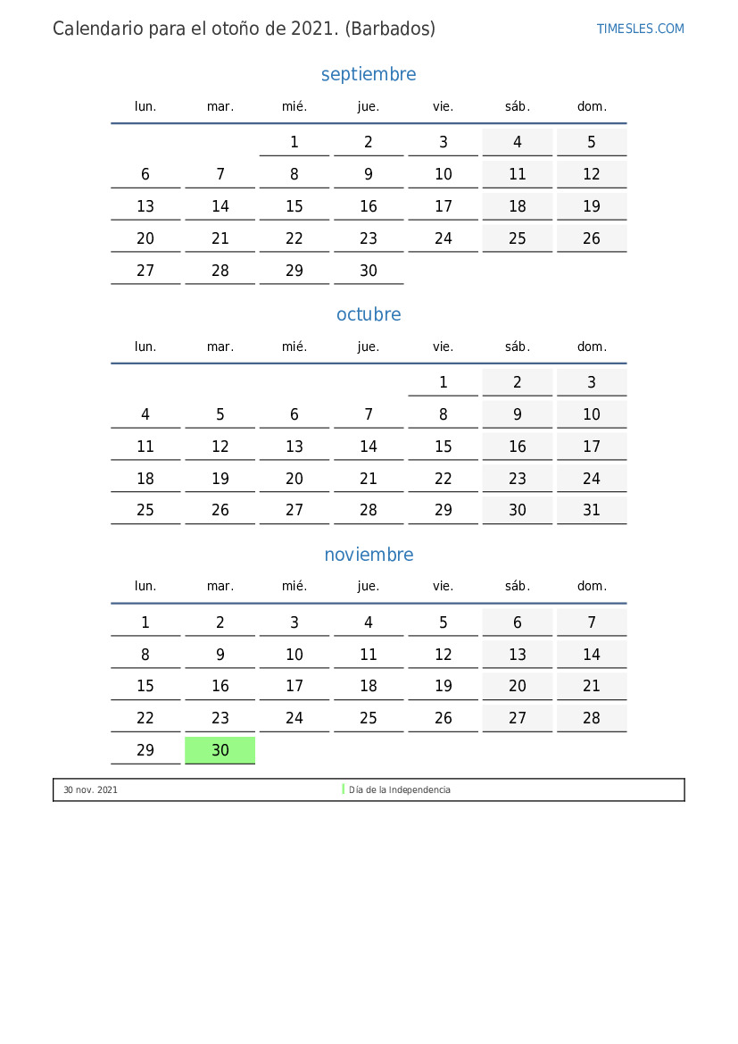 Descargue e imprima el calendario en PDF con festivos y fines de semana para el otoño de 2021 para Barbados