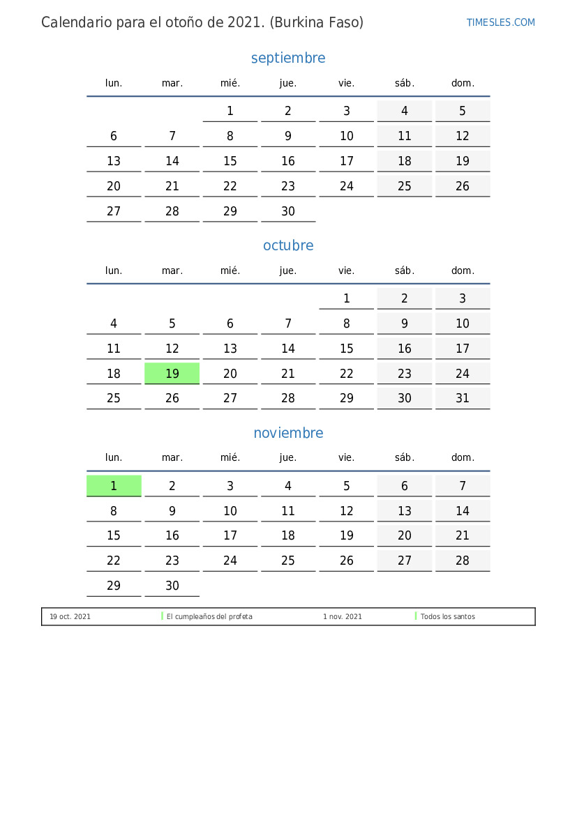 Descargue e imprima el calendario en PDF con festivos y fines de semana para el otoño de 2021 para Burkina Faso