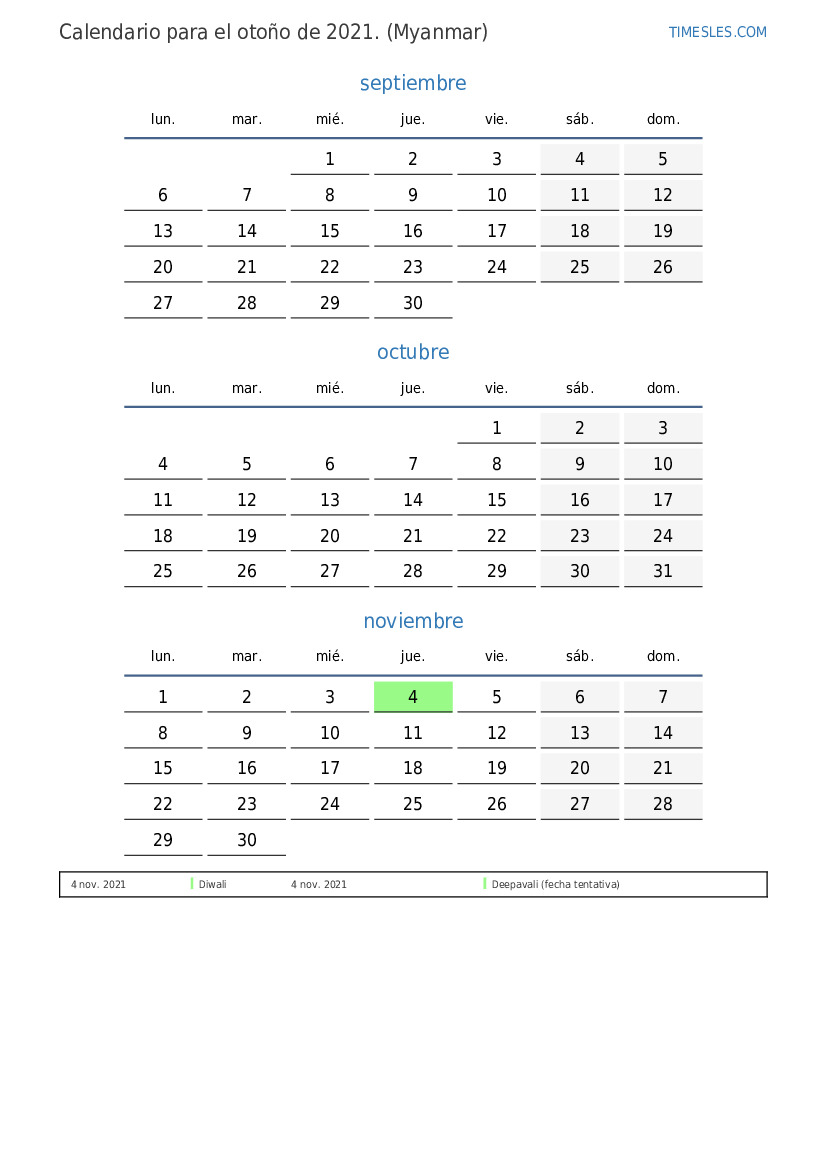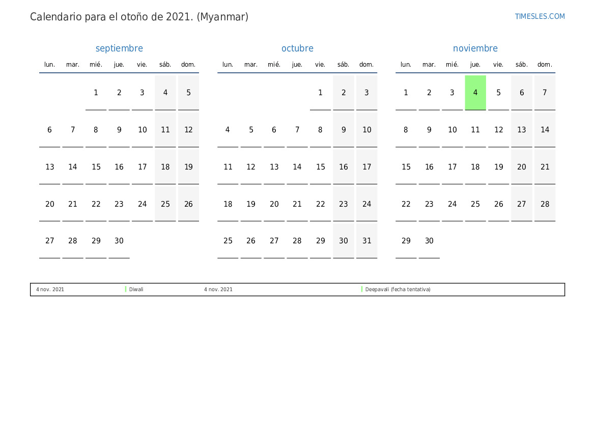Descargue e imprima el calendario en PDF con festivos y fines de semana para el otoño de 2021 para Myanmar