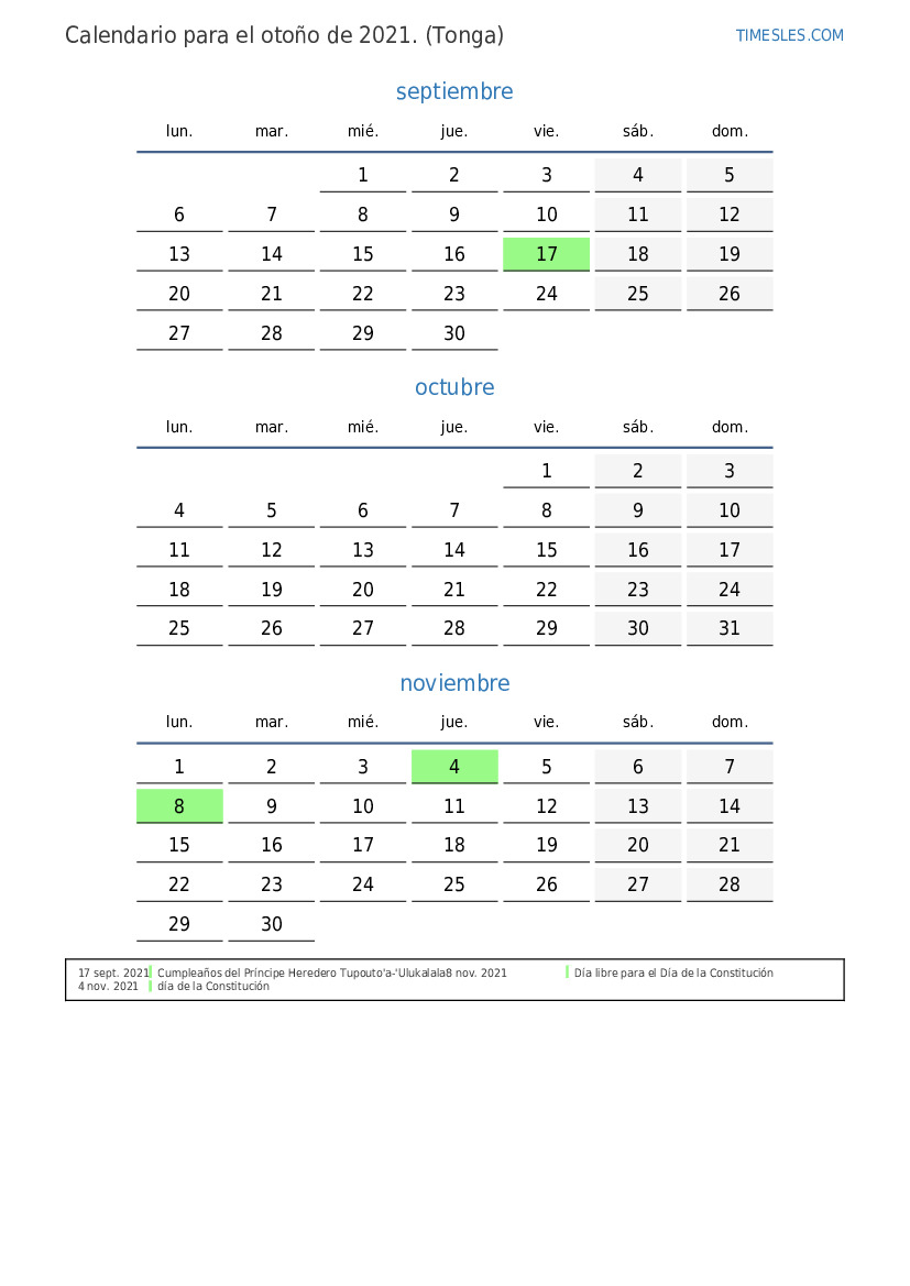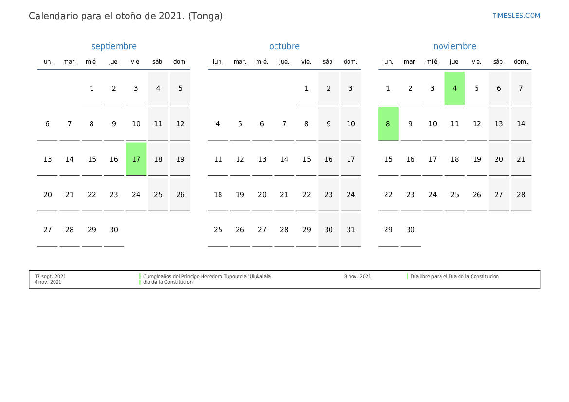 Descargue e imprima el calendario en PDF con festivos y fines de semana para el otoño de 2021 para Tonga