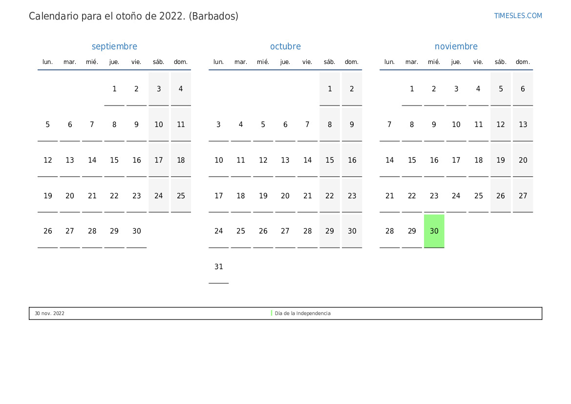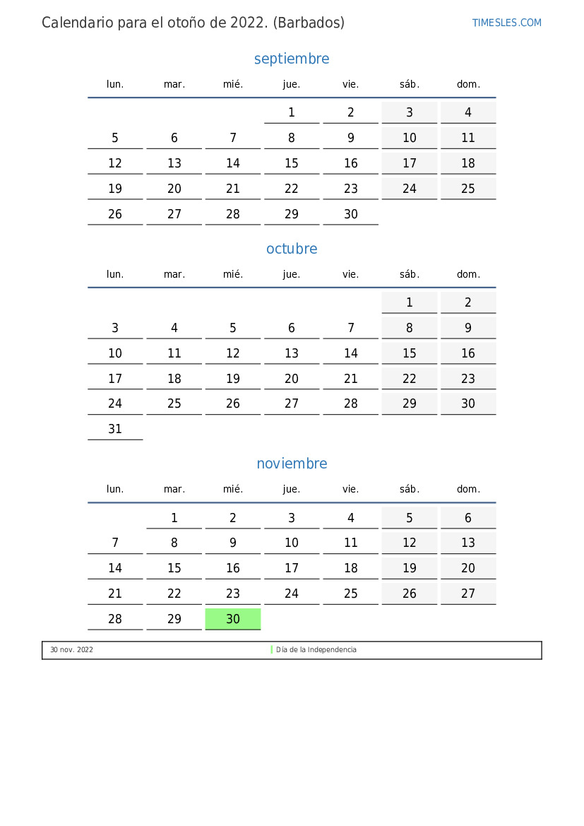 Descargue e imprima el calendario en PDF con festivos y fines de semana para el otoño de 2022 para Barbados