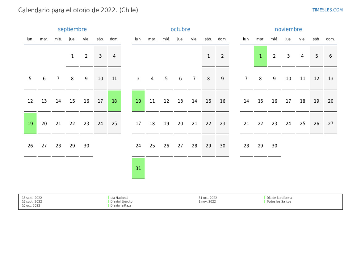 Descargue e imprima el calendario en PDF con festivos y fines de semana para el otoño de 2022 para Chile