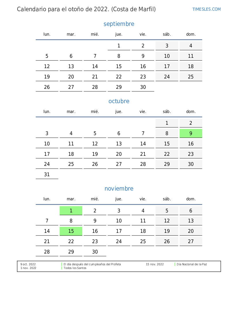Descargue e imprima el calendario en PDF con festivos y fines de semana para el otoño de 2022 para Cote d'Ivoire