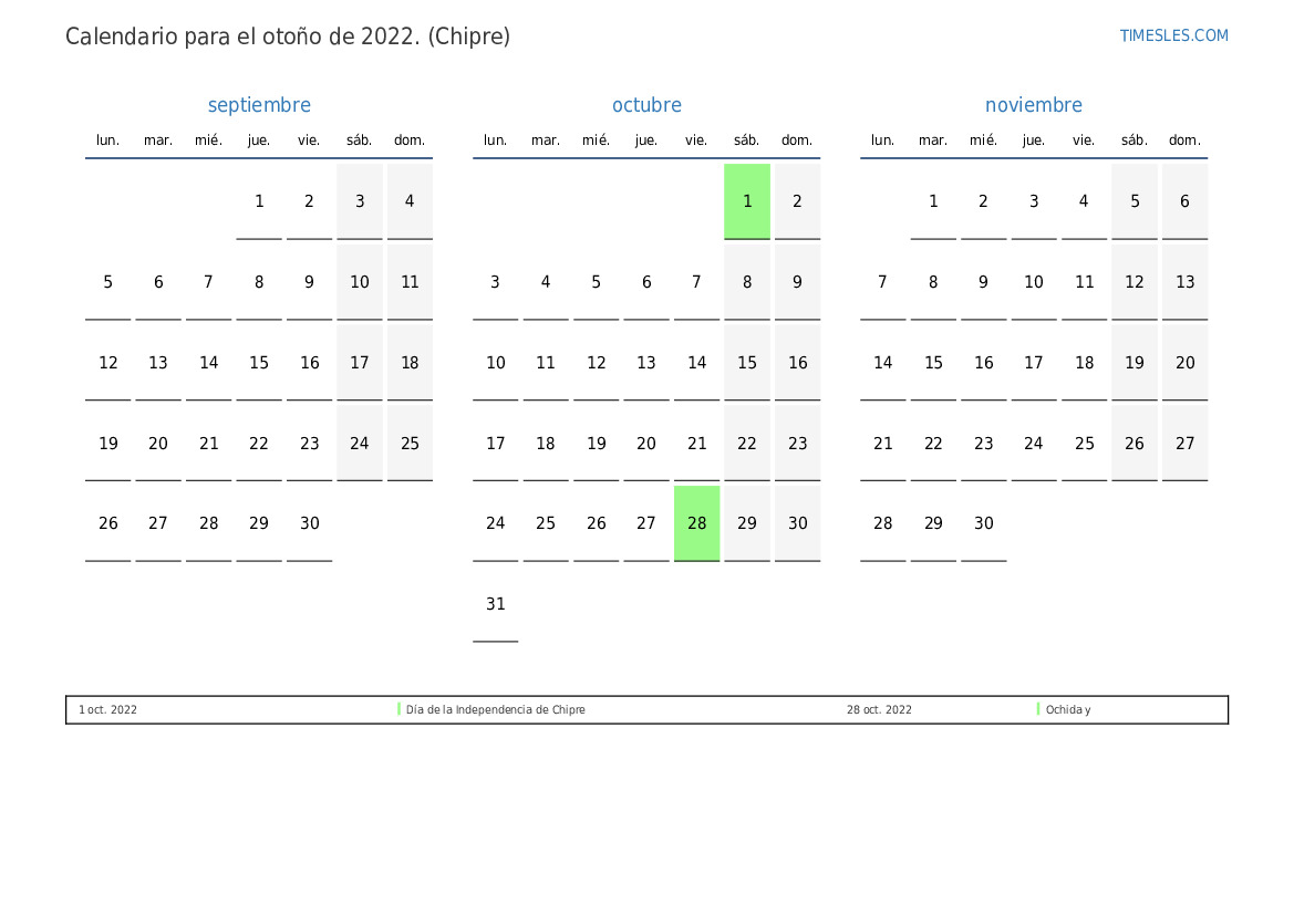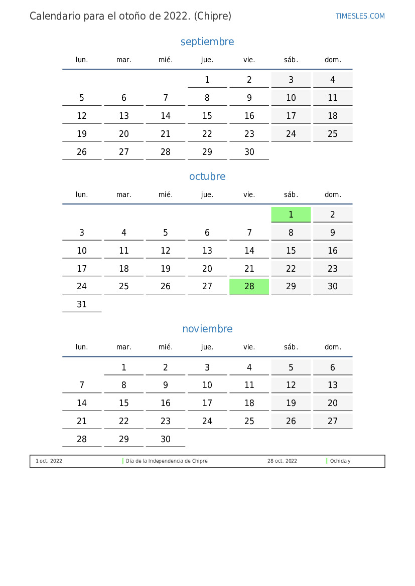 Descargue e imprima el calendario en PDF con festivos y fines de semana para el otoño de 2022 para Chipre