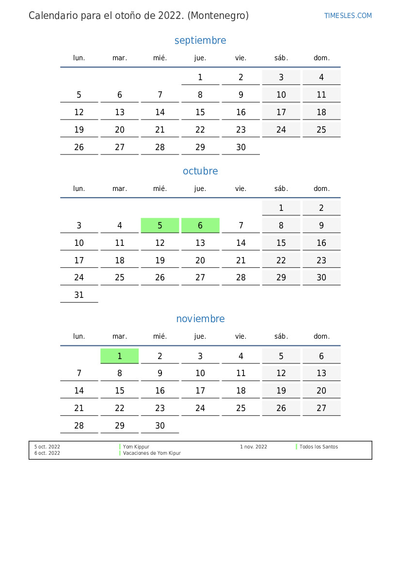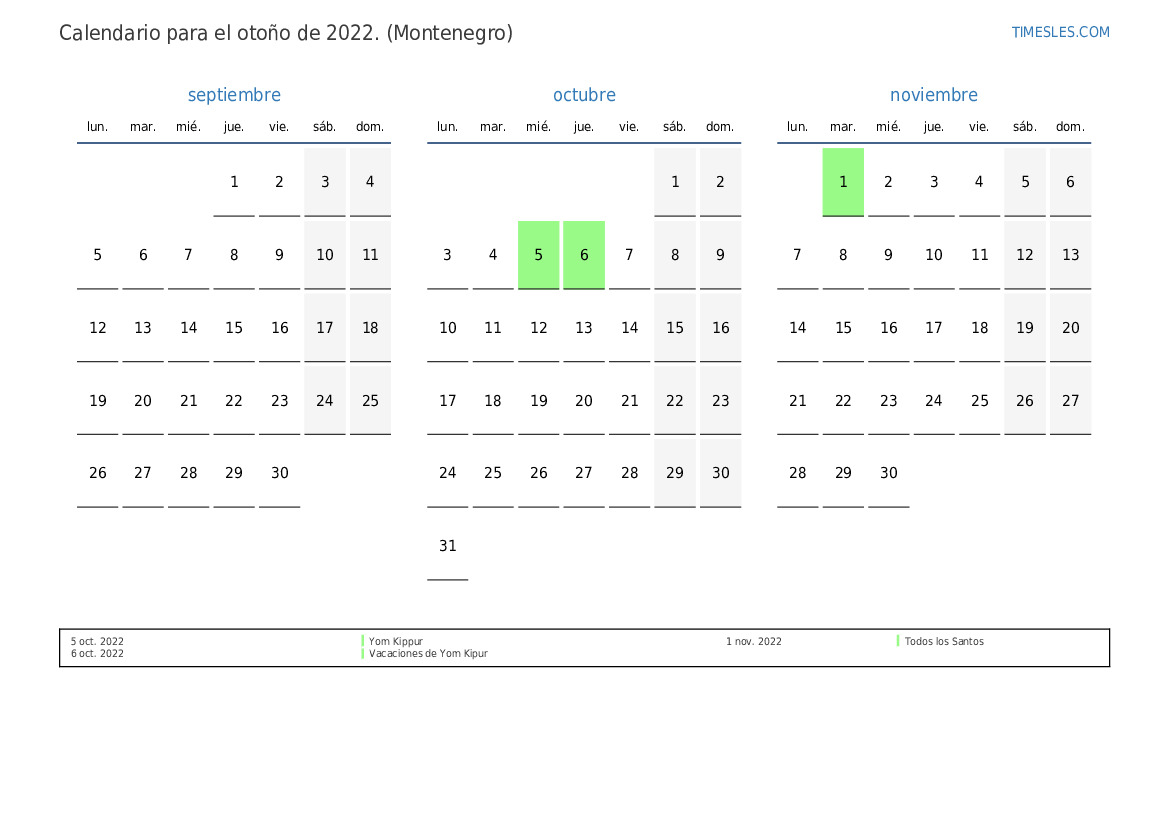 Descargue e imprima el calendario en PDF con festivos y fines de semana para el otoño de 2022 para Montenegro