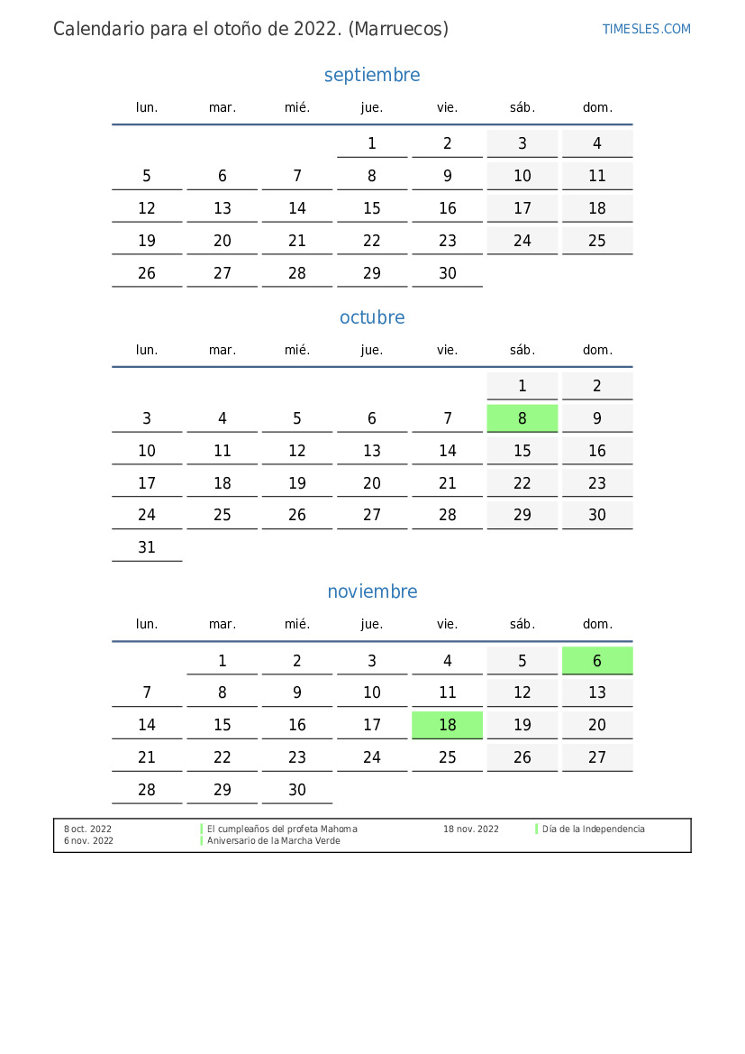 Descargue e imprima el calendario en PDF con festivos y fines de semana para el otoño de 2022 para Marruecos