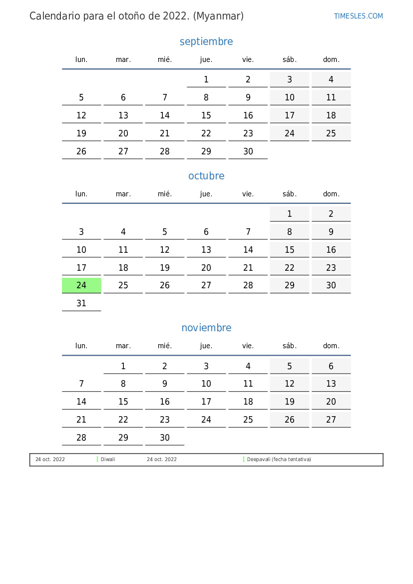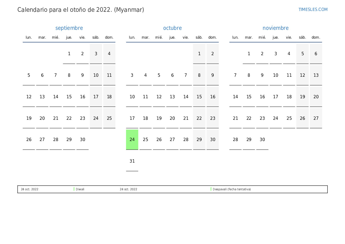 Descargue e imprima el calendario en PDF con festivos y fines de semana para el otoño de 2022 para Myanmar