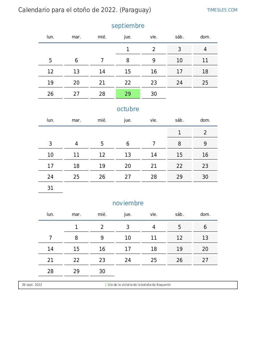 Descargue e imprima el calendario en PDF con festivos y fines de semana para el otoño de 2022 para Paraguay