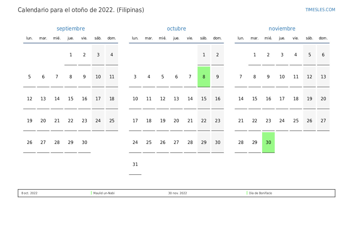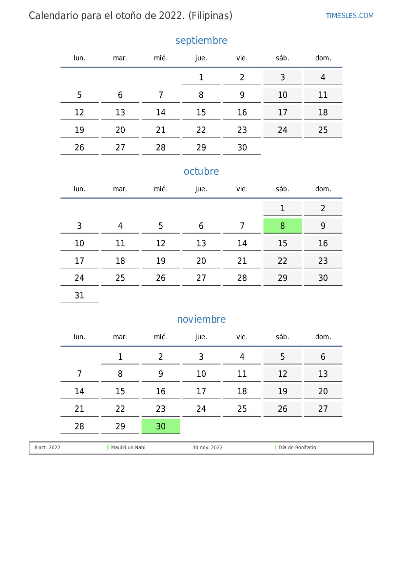 Descargue e imprima el calendario en PDF con festivos y fines de semana para el otoño de 2022 para Filipinas