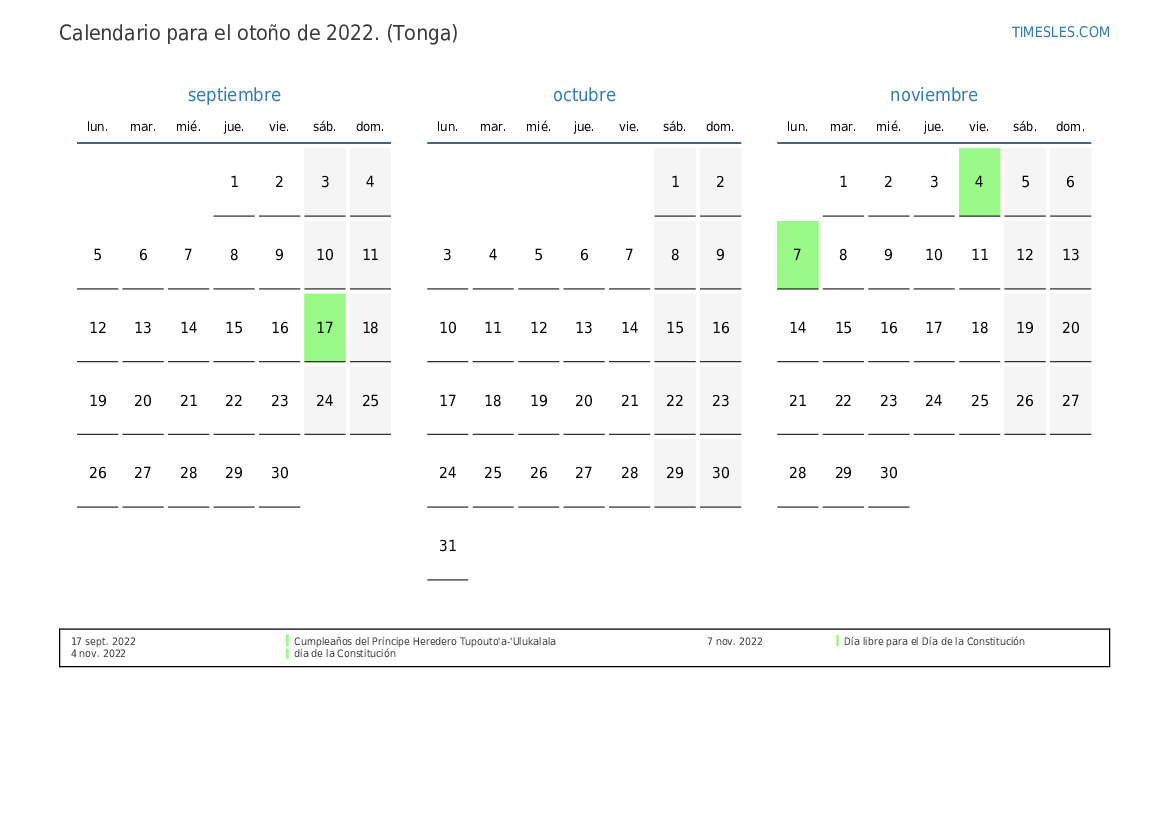 Descargue e imprima el calendario en PDF con festivos y fines de semana para el otoño de 2022 para Tonga
