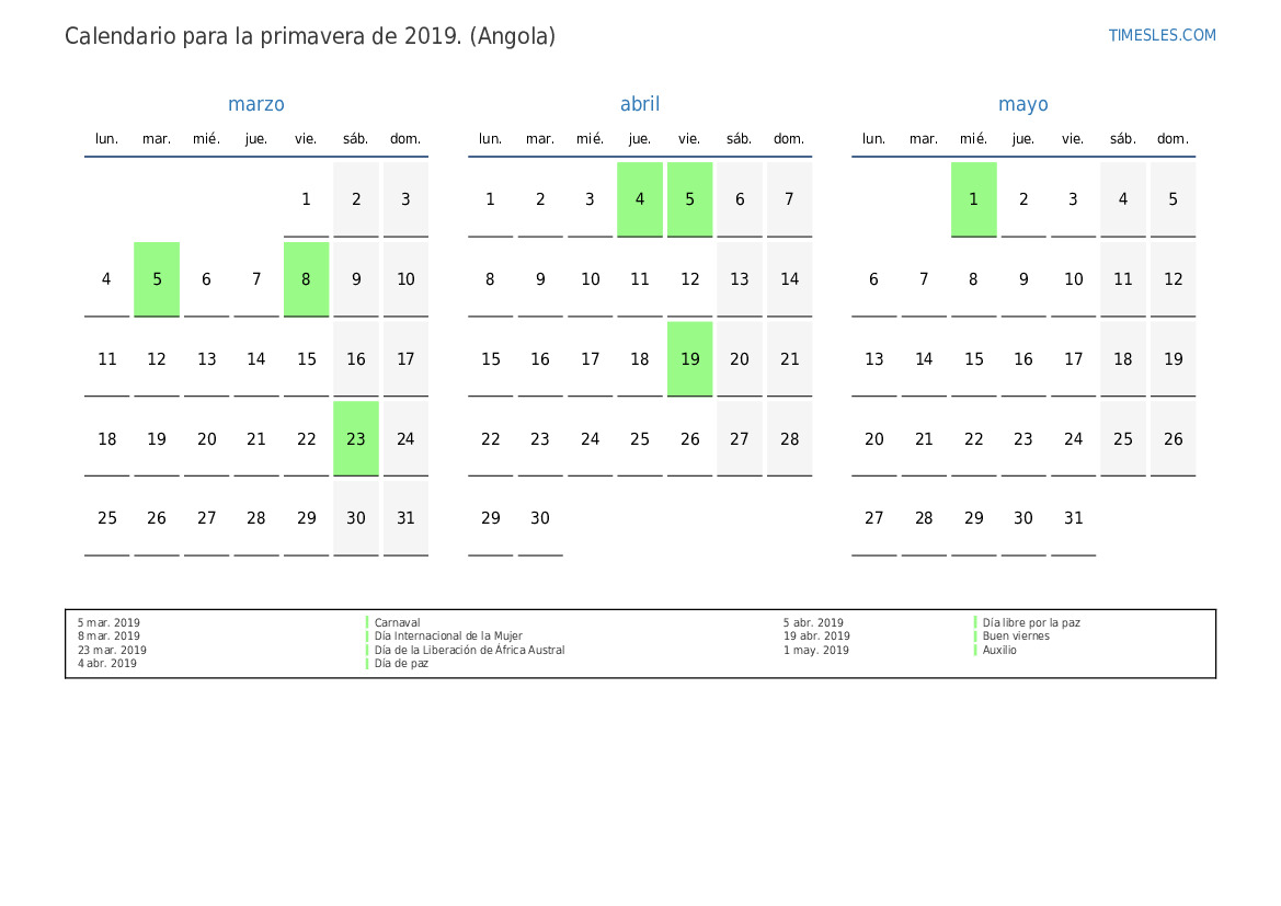Calendario de festivos y fines de semana para la primavera de 2019 para Angola