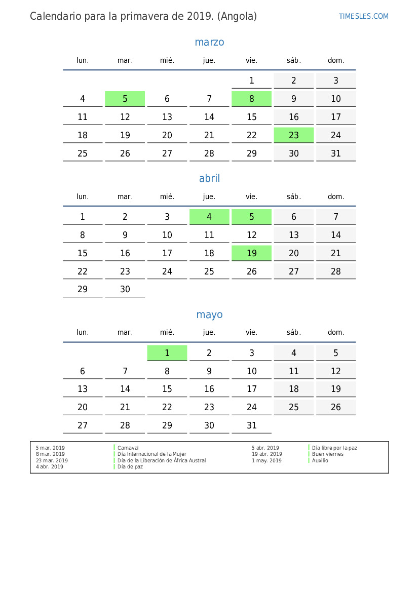 Descargue e imprima el calendario en PDF con festivos y fines de semana para la primavera de 2019 para Angola