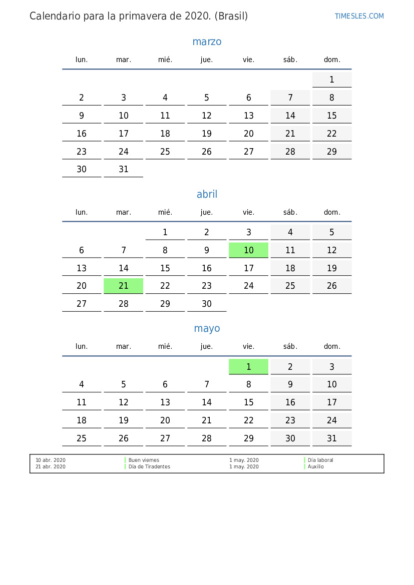 Descargue e imprima el calendario en PDF con festivos y fines de semana para la primavera de 2020 para Brasil