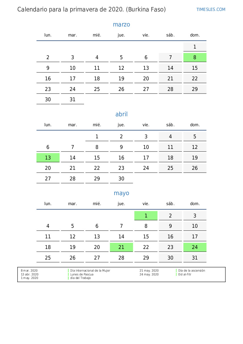 Calendario para la primavera 2020 para Burkina Faso