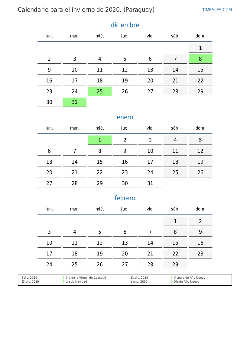 Descargue e imprima el calendario en PDF con festivos y fines de semana para la primavera de 2020 para Paraguay