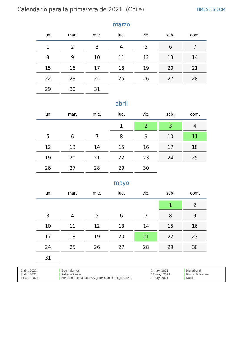 Descargue e imprima el calendario en PDF con festivos y fines de semana para la primavera de 2021 para Chile