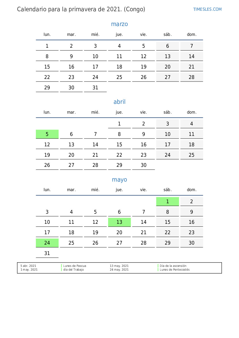 Descargue e imprima el calendario en PDF con festivos y fines de semana para la primavera de 2021 para el Congo