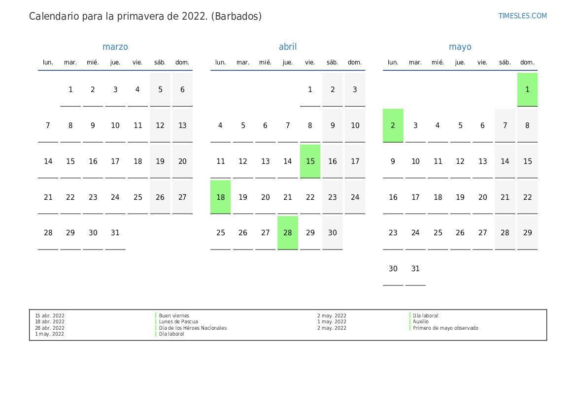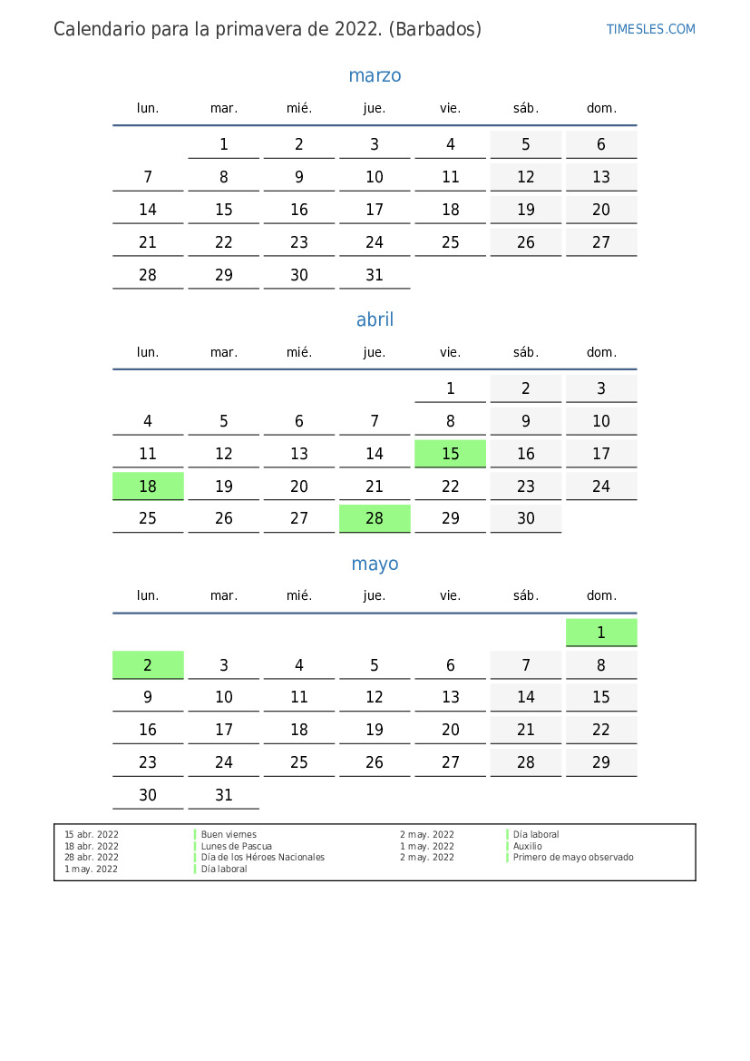 Descargue e imprima el calendario en PDF con festivos y fines de semana para la primavera de 2022 para Barbados
