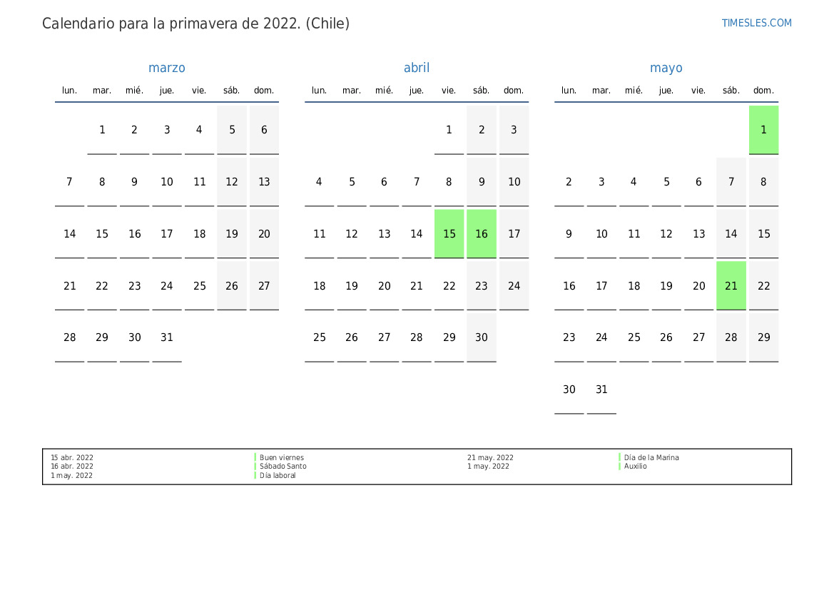 Descargue e imprima el calendario en PDF con festivos y fines de semana para la primavera de 2022 para Chile