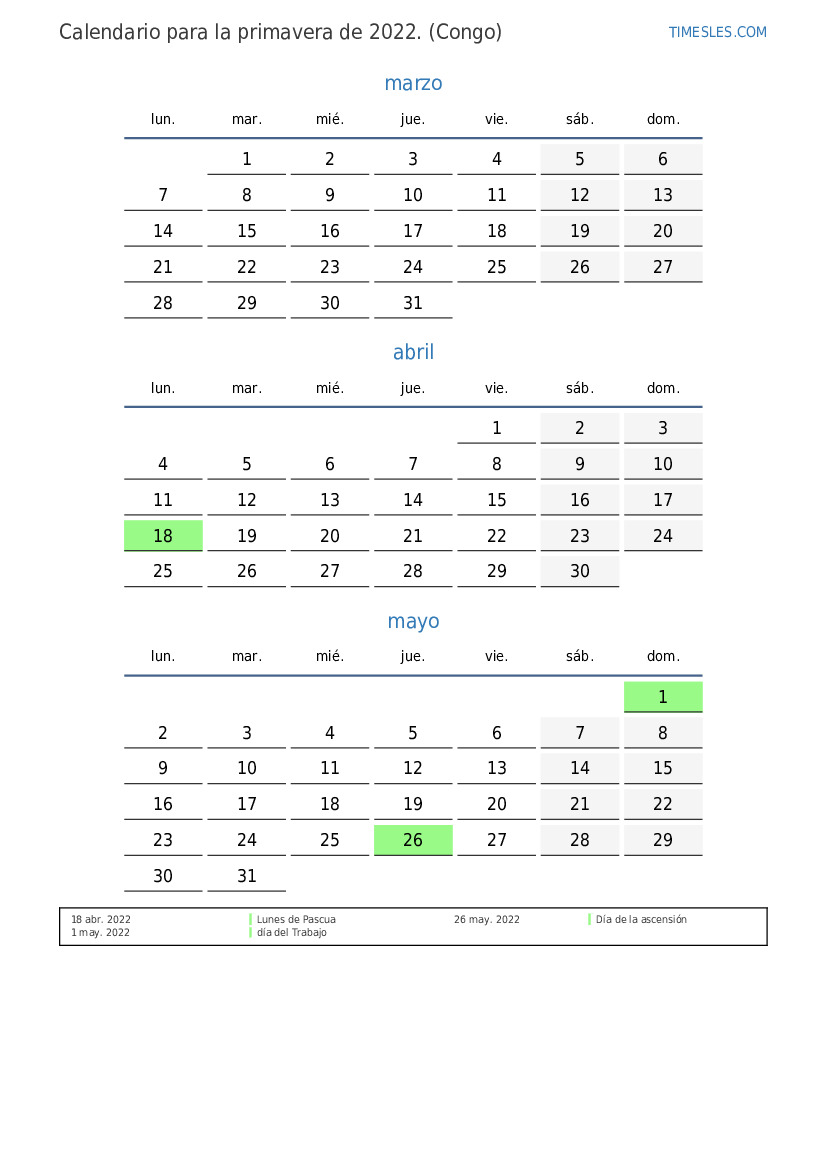 Calendario de festivos y fines de semana para la primavera de 2022 para el Congo