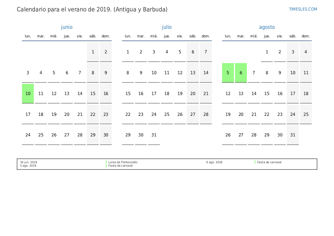 Calendario de festivos y fines de semana para el verano de 2019 para Antigua y Barbuda