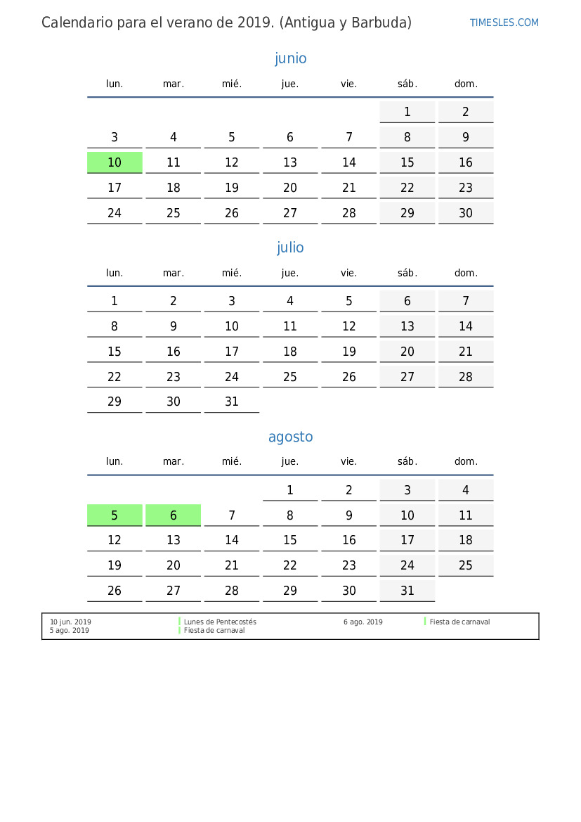 Descargue e imprima el calendario en PDF con festivos y fines de semana para el verano de 2019 para Antigua y Barbuda