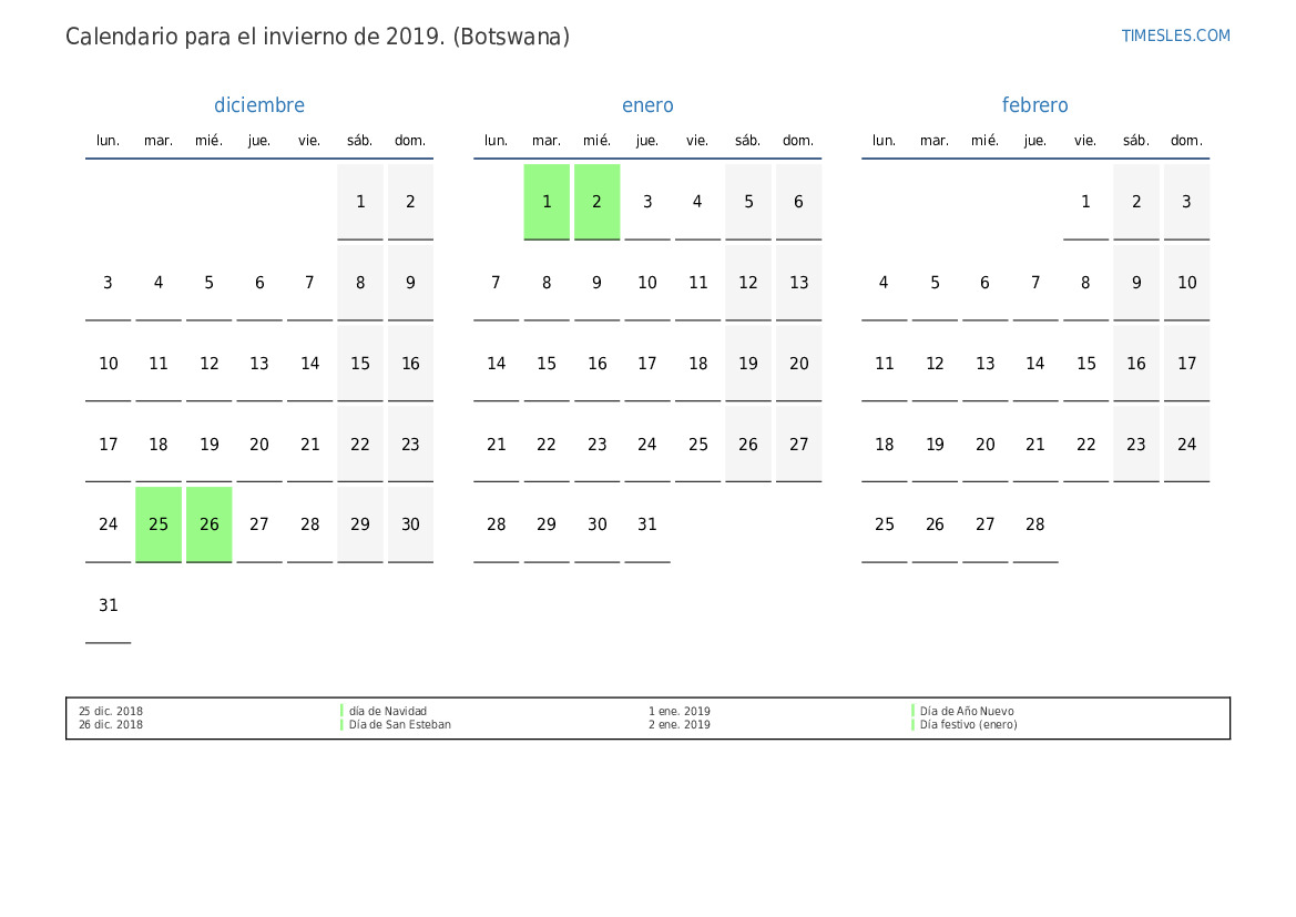 Calendario para el verano 2019 para Botswana