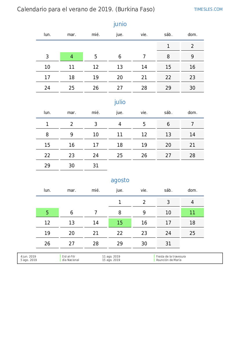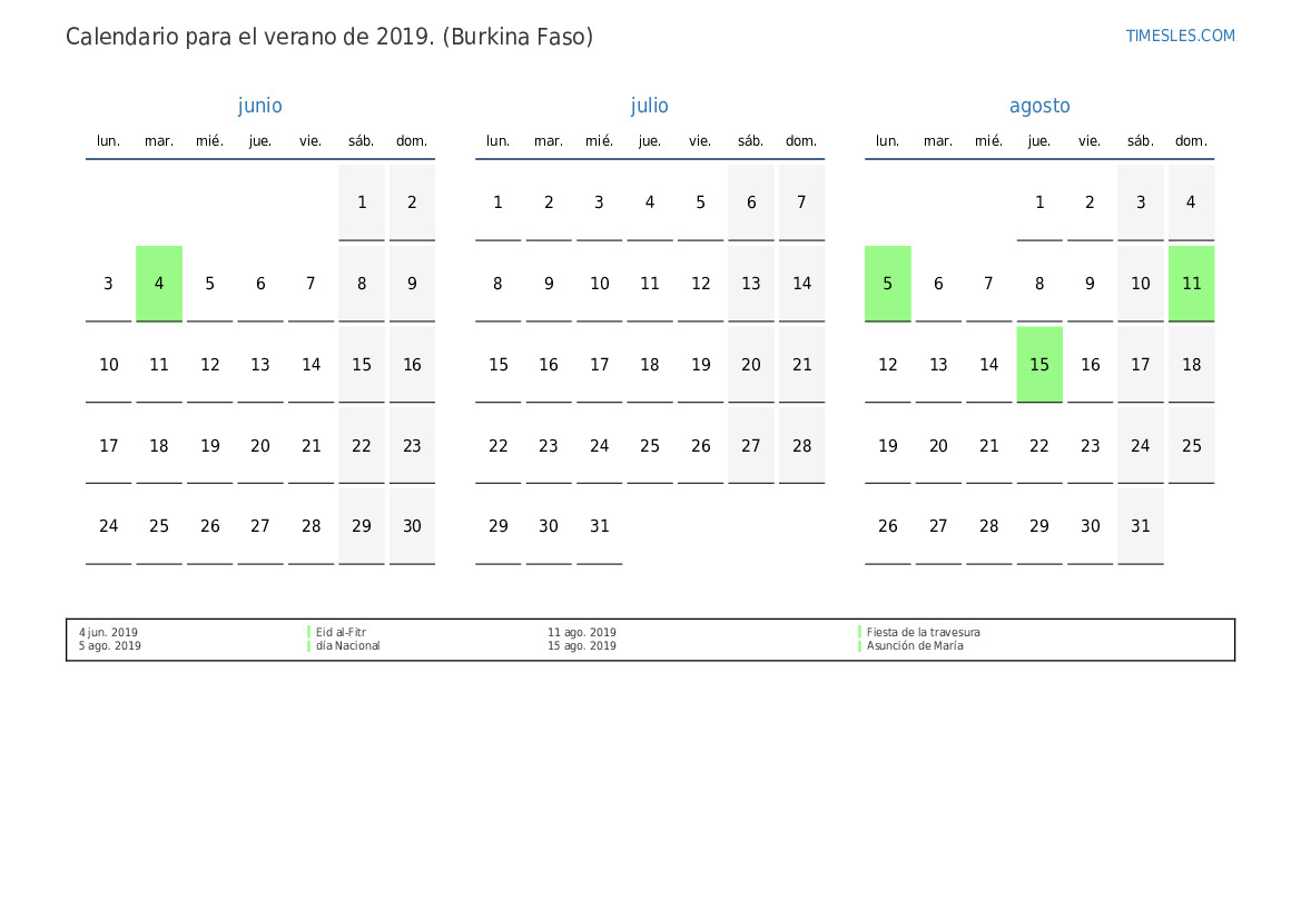 Calendario de festivos y fines de semana para el verano de 2019 para Burkina Faso