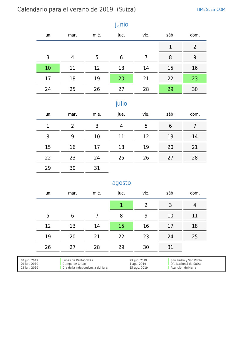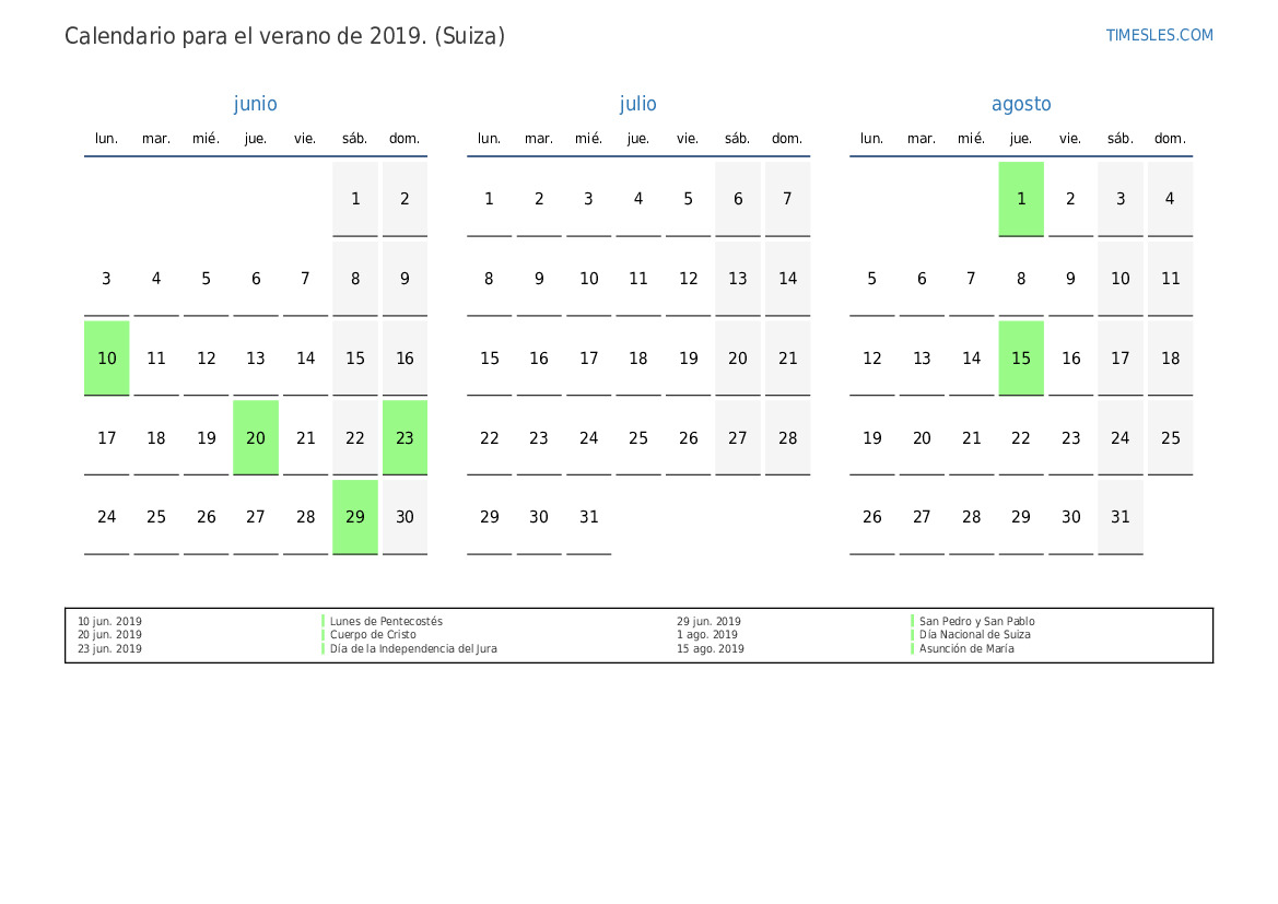 Calendario para el verano 2019 para Suiza