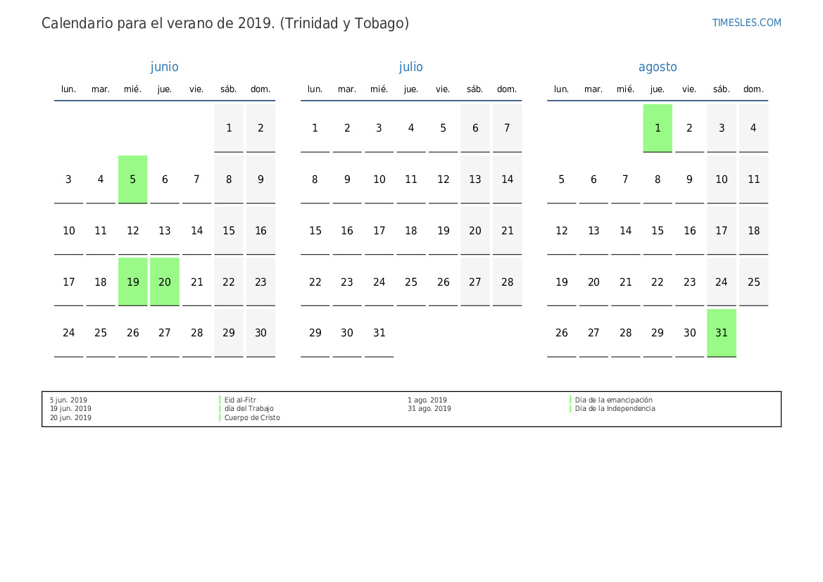 Descargue e imprima el calendario en PDF con festivos y fines de semana para el verano de 2019 para Trinidad y Tobago