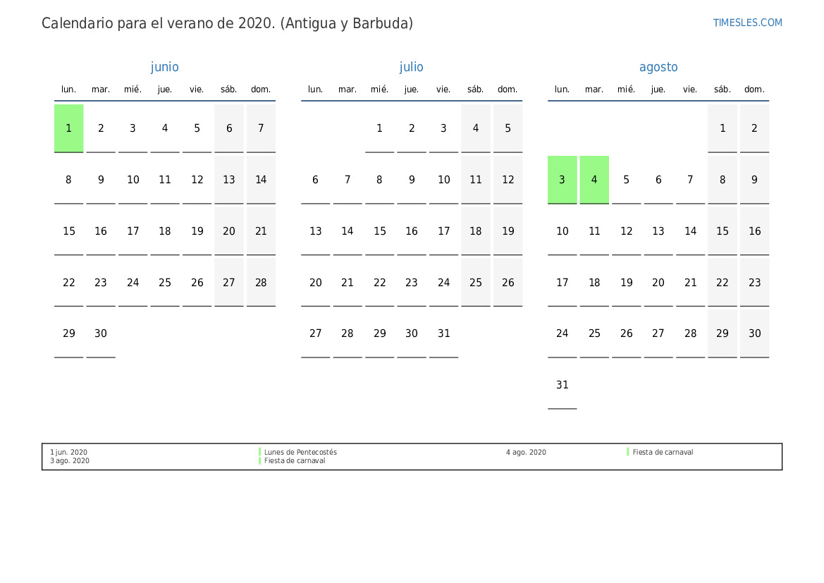 Descargue e imprima el calendario en PDF con festivos y fines de semana para el verano de 2020 para Antigua y Barbuda