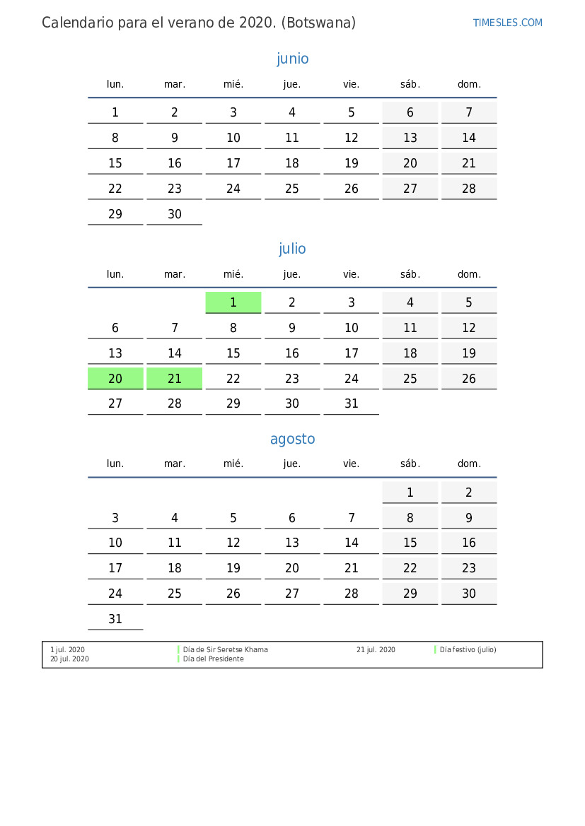 Descargue e imprima el calendario en PDF con festivos y fines de semana para el verano de 2020 para Botswana
