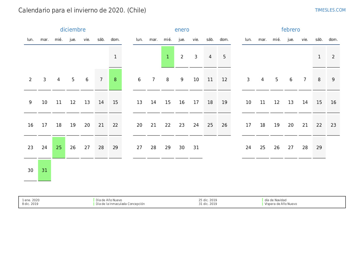 Descargue e imprima el calendario en PDF con festivos y fines de semana para el verano de 2020 para Chile