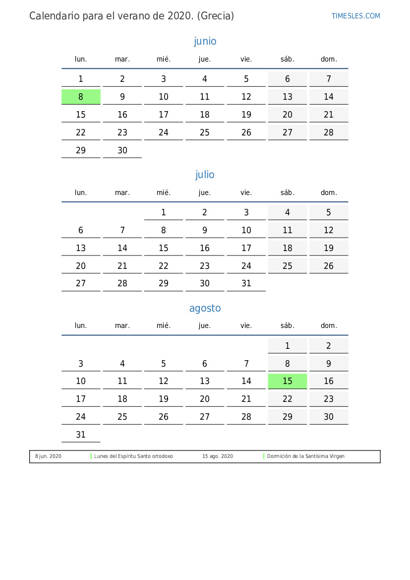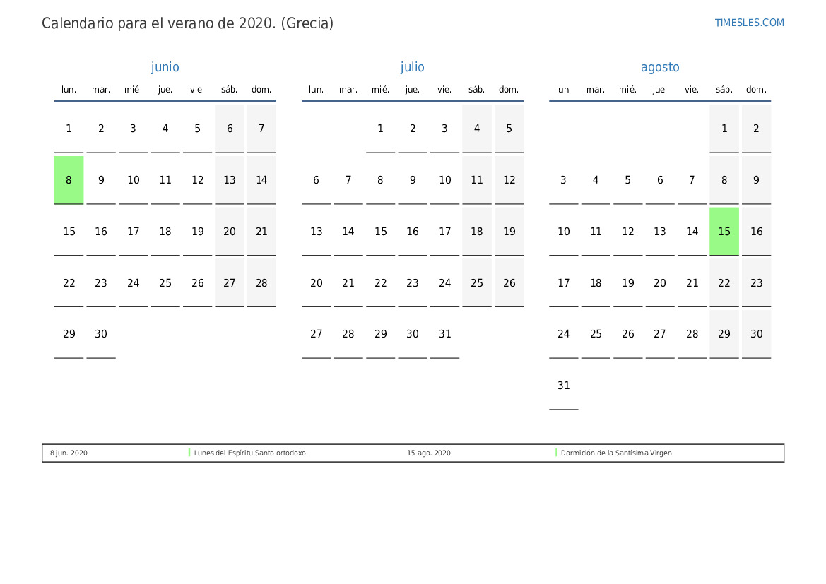Descargue e imprima el calendario en PDF con festivos y fines de semana para el verano de 2020 para Grecia