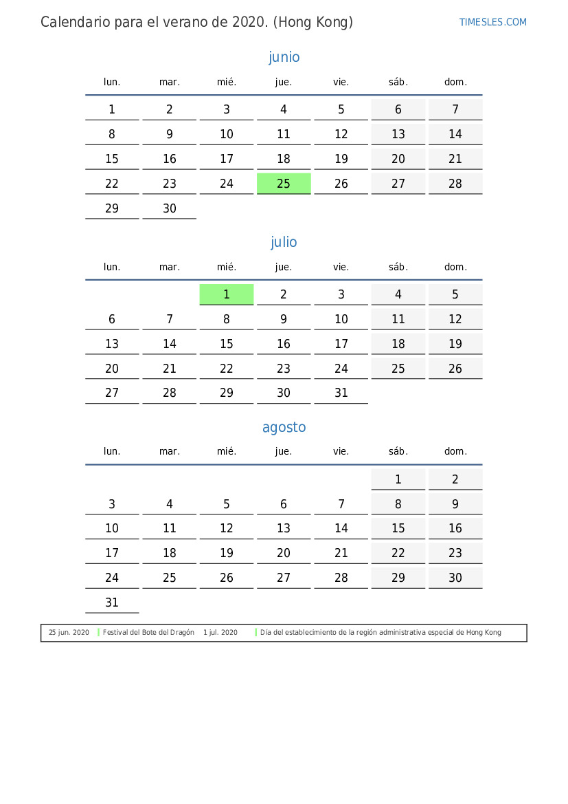 Descargue e imprima el calendario en PDF con festivos y fines de semana para el verano de 2020 para Hong Kong