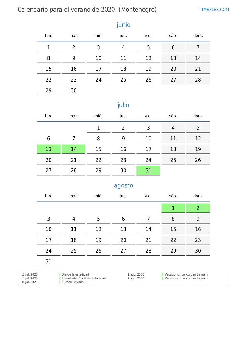 Descargue e imprima el calendario en PDF con festivos y fines de semana para el verano de 2020 para Montenegro