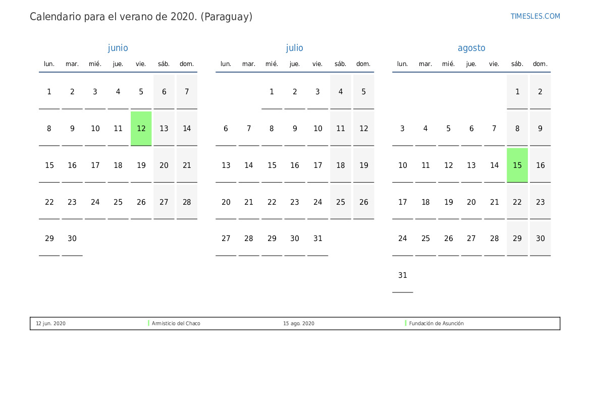 Descargue e imprima el calendario en PDF con festivos y fines de semana para el verano de 2020 para Paraguay