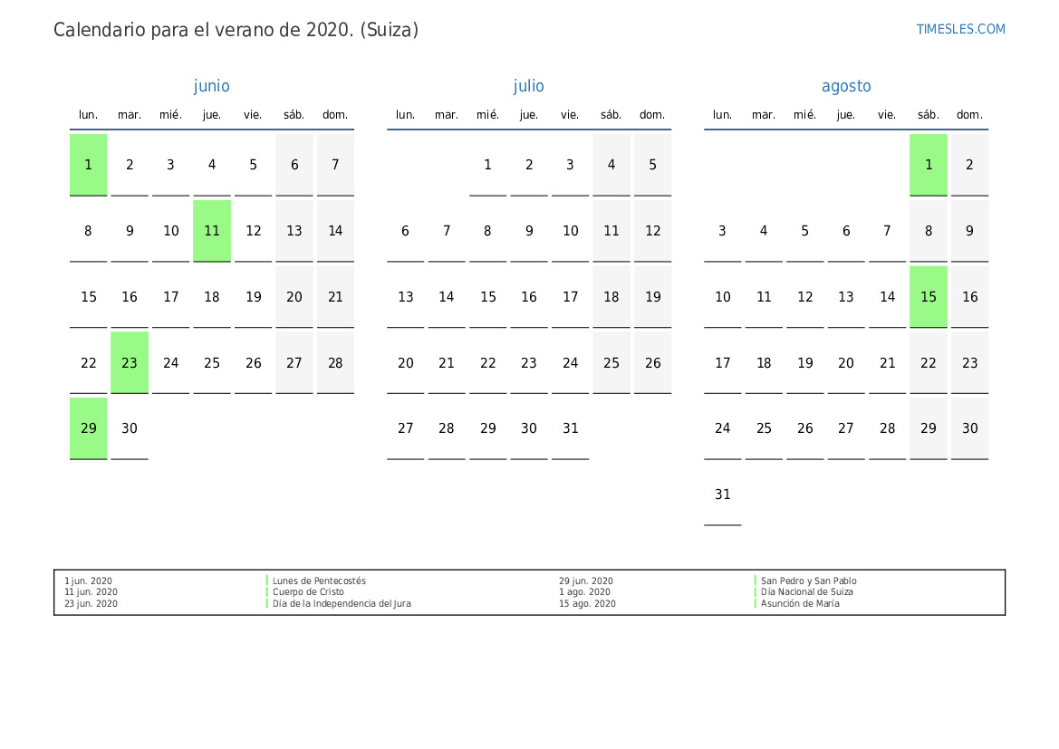 En el verano de 2020, hay 7 feriados y días libres En Suiza. El verano de 2020 comienza el lunes y finaliza el lunes.
