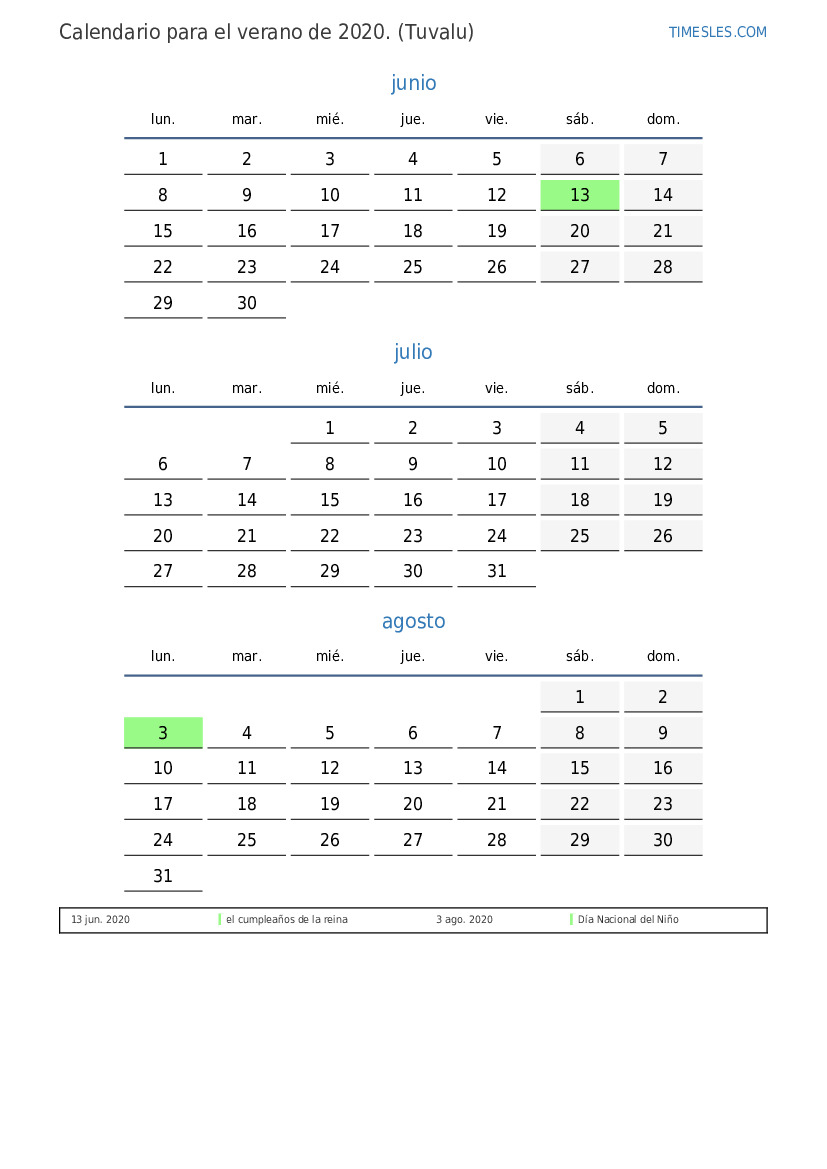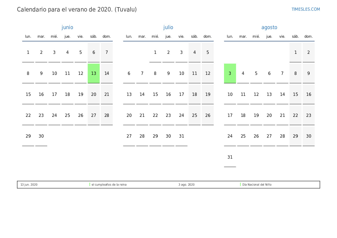 Descargue e imprima el calendario en PDF con festivos y fines de semana para el verano de 2020 para Tuvalu