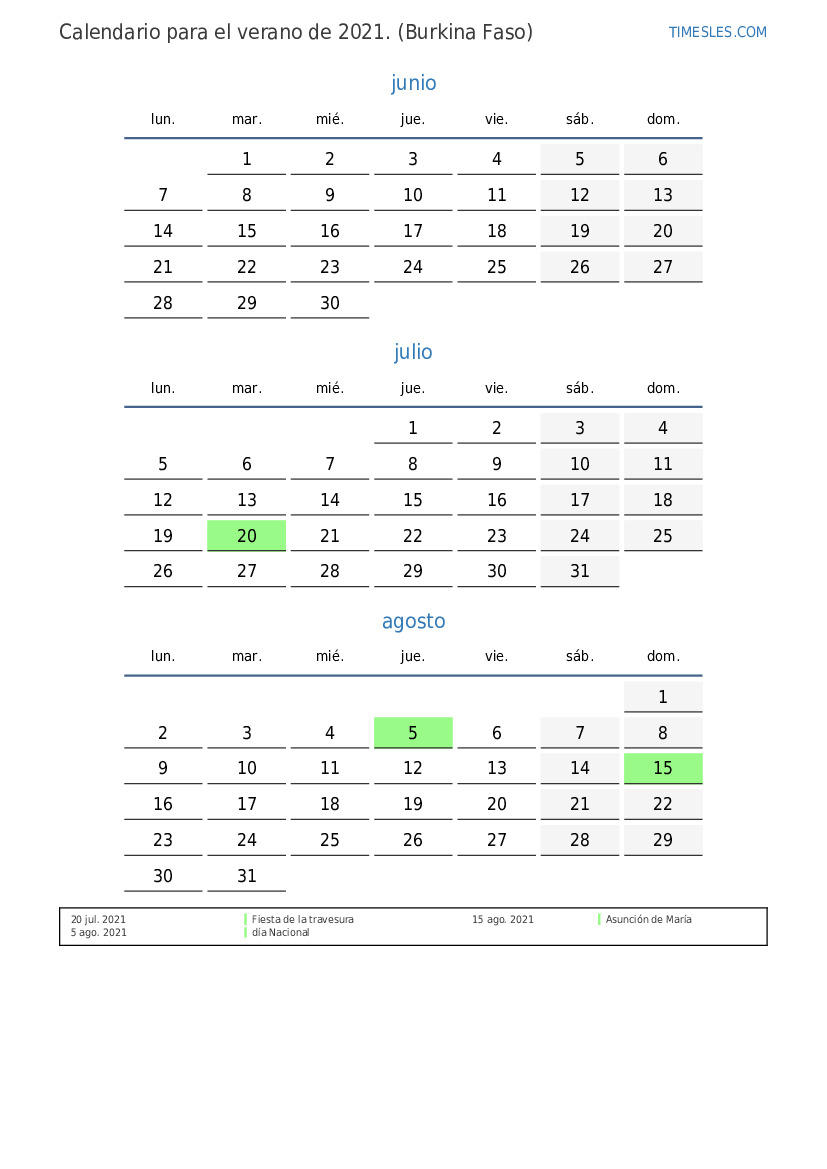 En el verano de 2021, hay 4 feriados y días libres en Burkina Faso. El verano de 2021 comienza el martes y finaliza el martes.