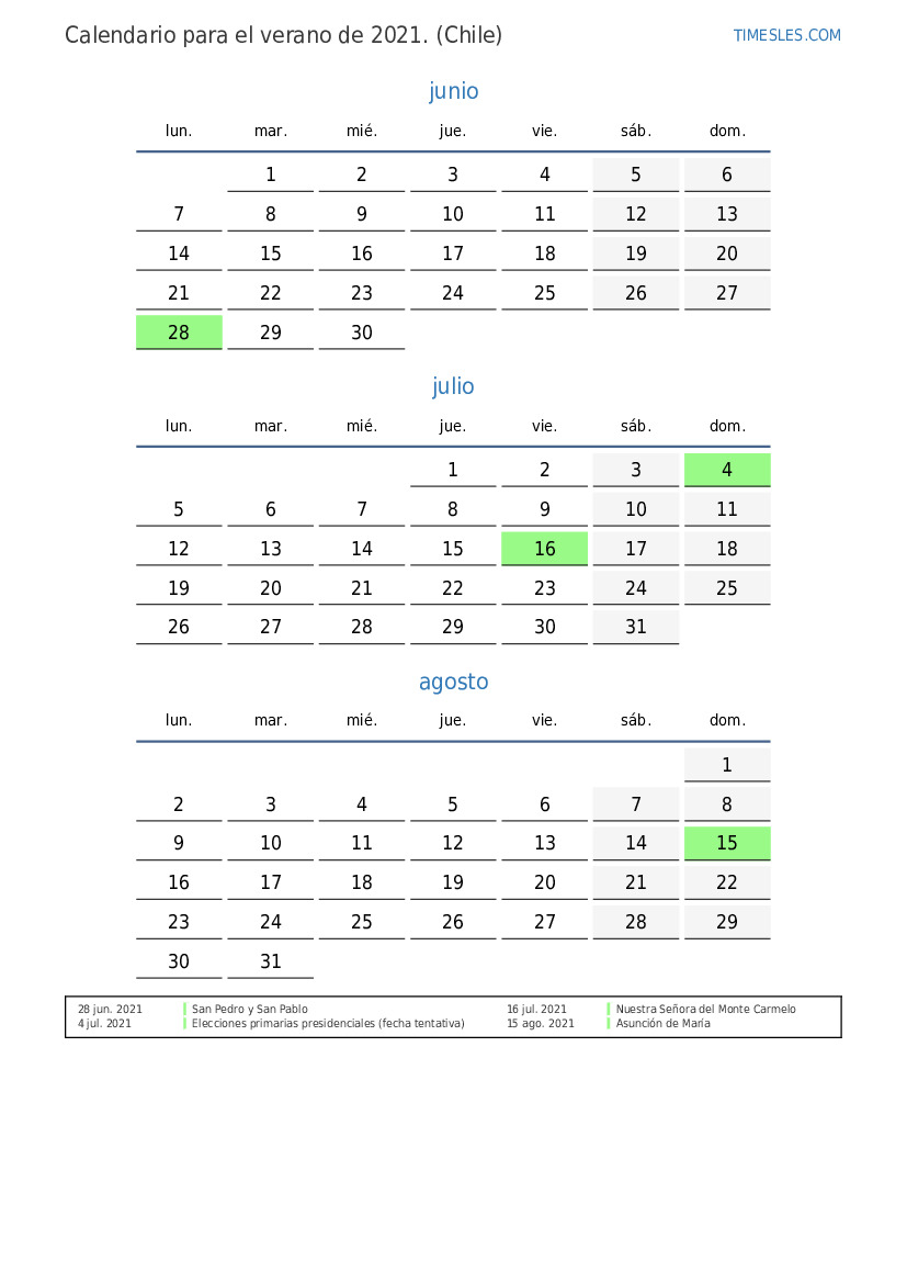 Descargue e imprima el calendario en PDF con festivos y fines de semana para el verano de 2021 para Chile