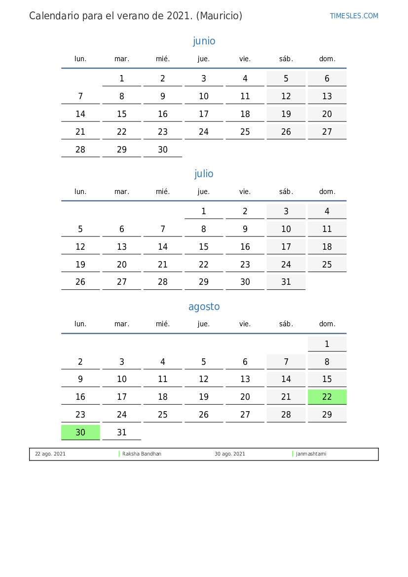 Descargue e imprima el calendario en PDF con festivos y fines de semana para el verano de 2021 para Mauricio