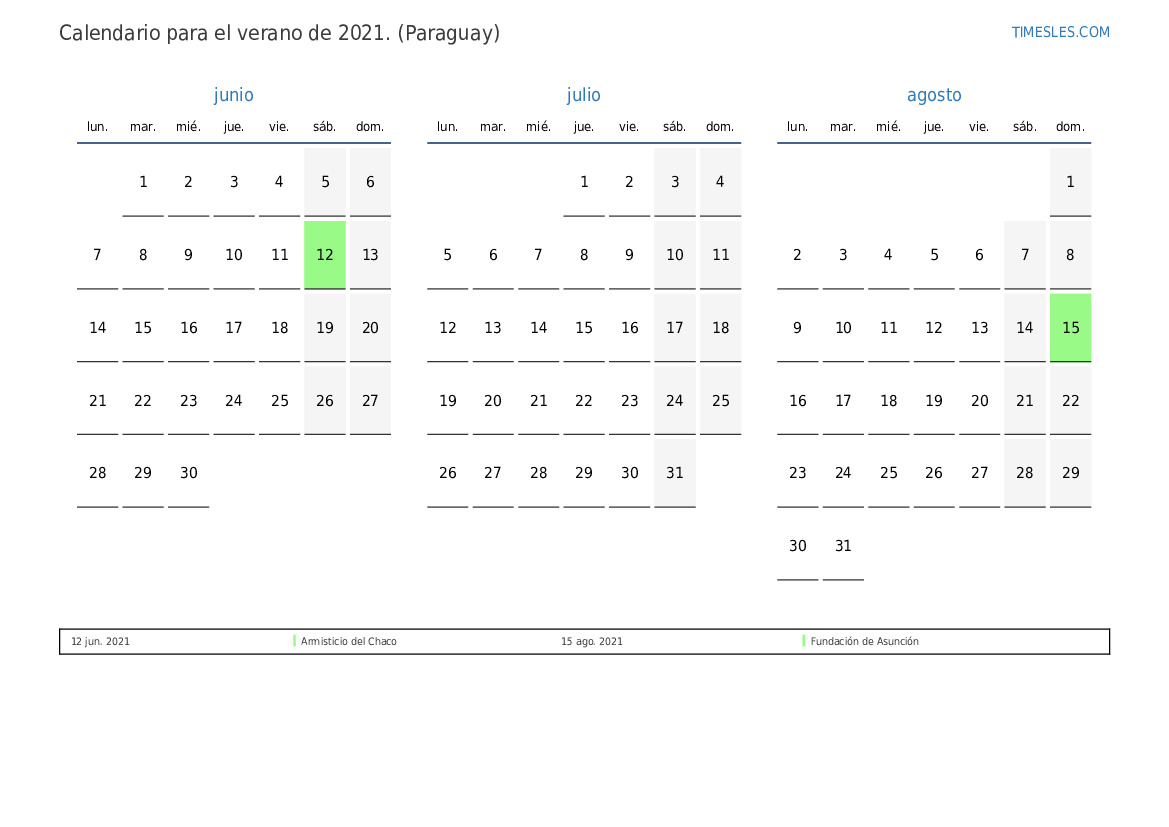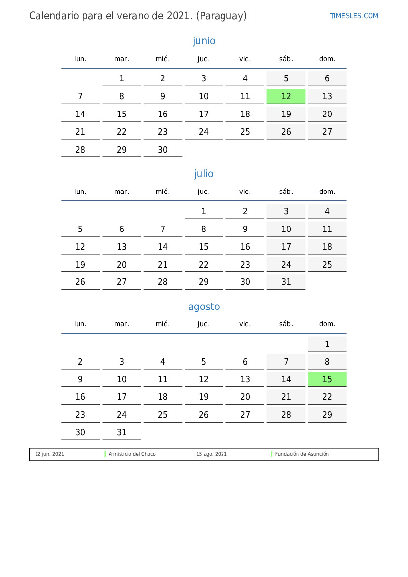 Descargue e imprima el calendario en PDF con festivos y fines de semana para el verano de 2021 para Paraguay