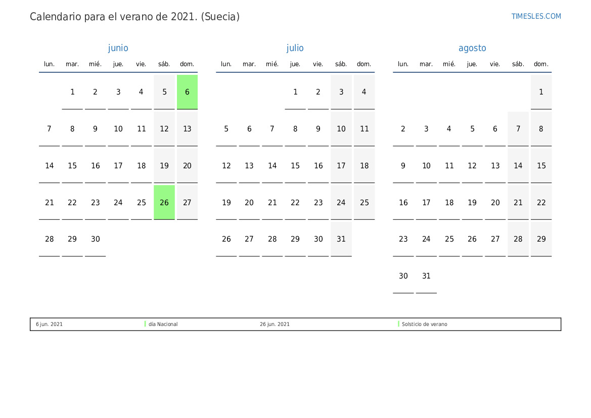 En el verano de 2021, hay 4 feriados y días libres en Suecia. El verano de 2021 comienza el martes y finaliza el martes.