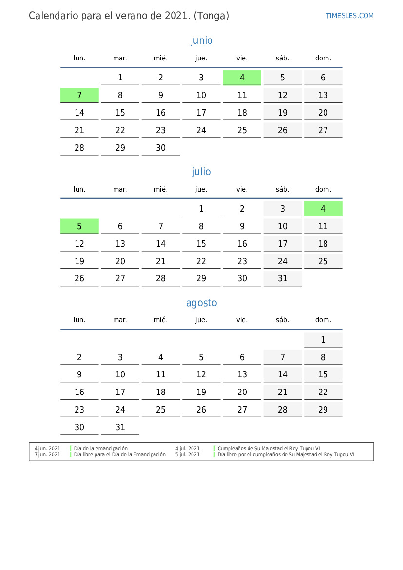 Descargue e imprima el calendario en PDF con festivos y fines de semana para el verano de 2021 para Tonga